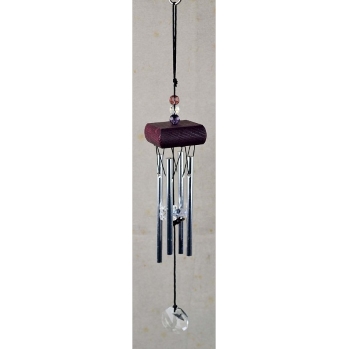 Decoratieve windgong, geschikt voor binnen, bevestigd aan een 4 x 4 cm Noord Amerikaans beukenhouten houder, metaal uitvoering.