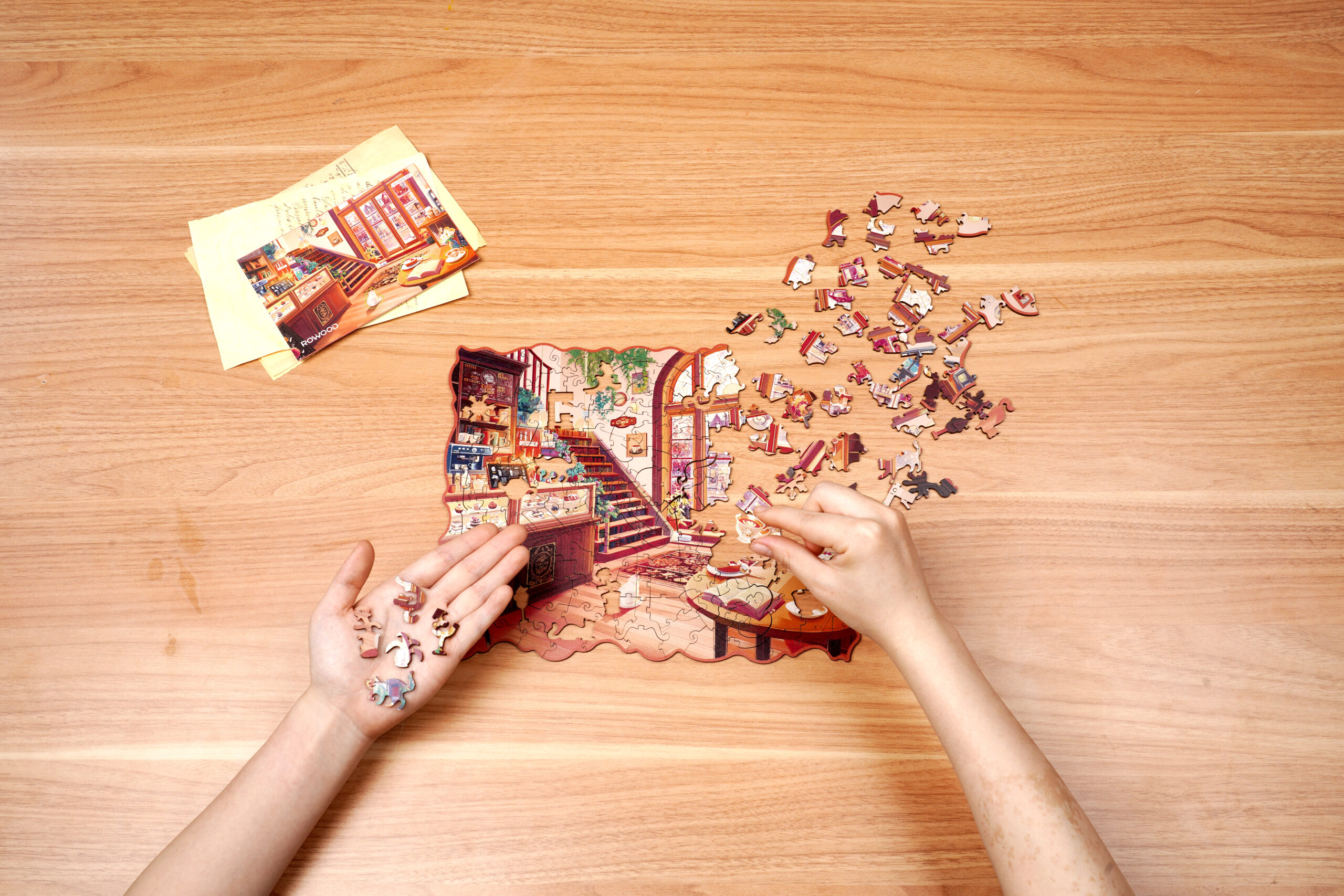 Een houten legpuzzel met uniek gevormde stukjes die het oog verwennen en de geest uitdagen.