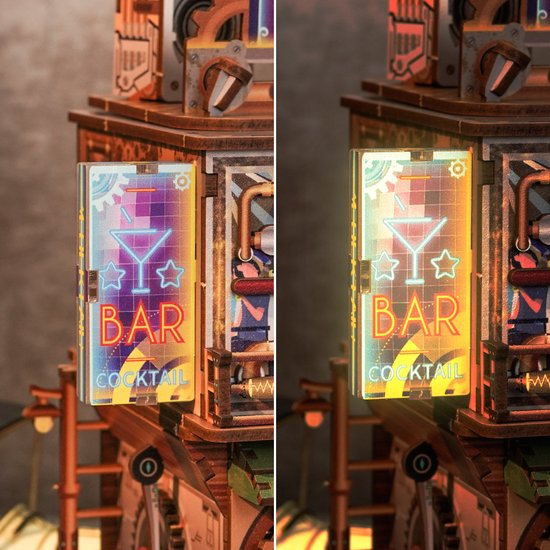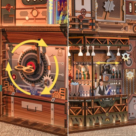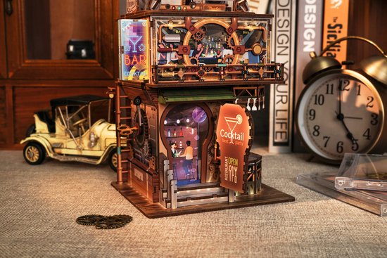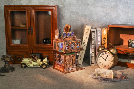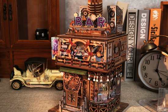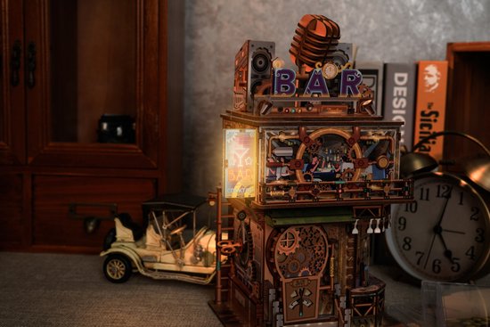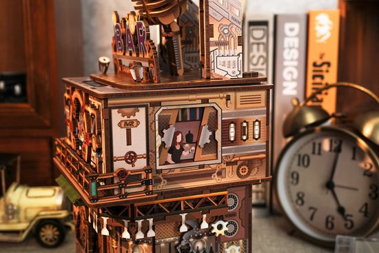 Koperen tandwielen, buizen, bouten en moeren? Dat riekt naar de unieke esthetiek van steampunk! Met elementen van de victoriaanse tijd vind je in jouw nieuwe punkbar retro-futurisme; de alternatieve geschiedenis die stoomkrachttechnologie combineert met het victoriaanse tijdperk. In dit fantasierijke houten bouwpakket voor volwassenen vind je houten deurtjes en luiken die open kunnen, maar ook een technisch hoogstandje. De klep van je bureauprullenbak gaat namelijk open op beweging!