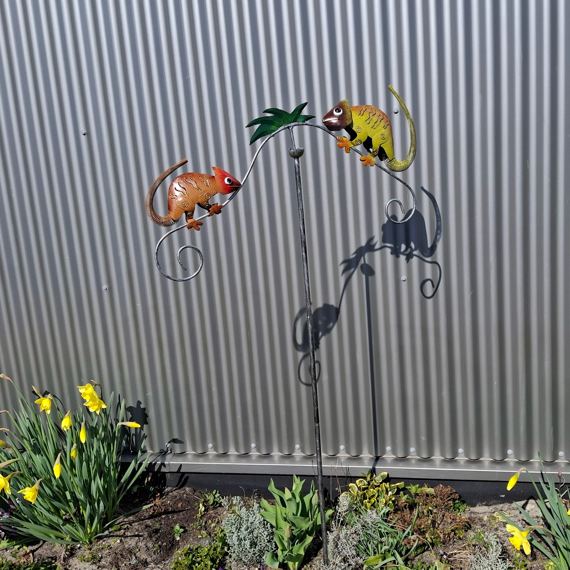 Metaal ronddraaiende Kameleons op een stok is een mooie toevoeging voor iedereen die van vrolijkheid en kleur houdt. Op de balansstok schommelen ze op en neer en draaien ze rond en zorgen zo voor een constante beweging in uw tuin. De steker gaat ongeveer 15 cm in de grond. Dit tuinornament is weerbestendig. Onze metalen tuin decoraties bijna allemaal met de hand gemaakt zijn, en ook met de hand beschilderd, kan het zijn dat de foto iets afwijkt van het aan u geleverde exemplaar.