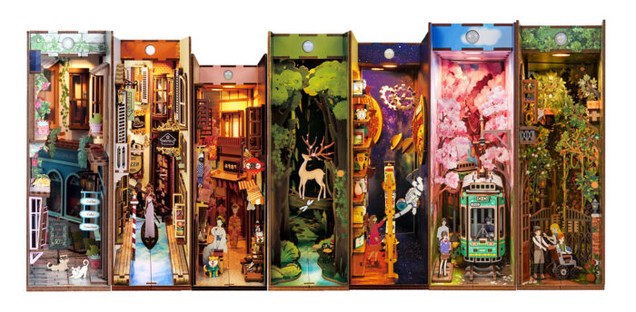Booknooks, oftewel boekensteunen, zijn miniatuurlandschappen of diorama’s die in een boekenplank geplaatst worden. Het is een leuke en originele manier om jouw boekenplank te versieren. De Tone Cheer booknooks van ArtBizniz kun je zelf in elkaar puzzelen. Uren speelplezier gegarandeerd! Booknooks zijn een kunstvorm tussen jouw boeken in de boekenkast. Het is echt houten modelbouw doordat je erg gedetailleerd te werk moet gaan. Booknooks brengen je boekenplank tot leven.